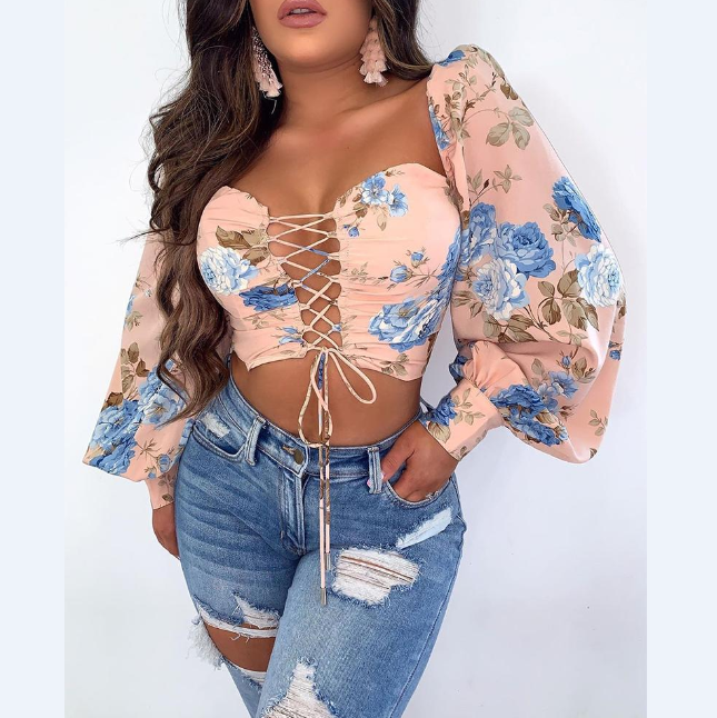 Long Sleeve Floral Drawstring Lace-Up Blouse