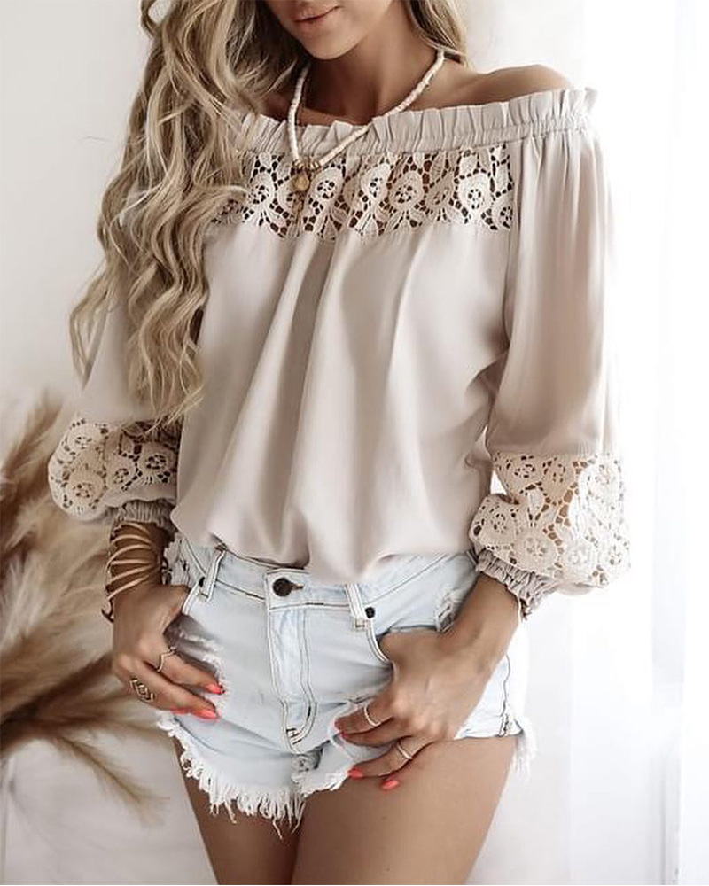 Casual Apricot Splicing Long-Sleeve Lace Top