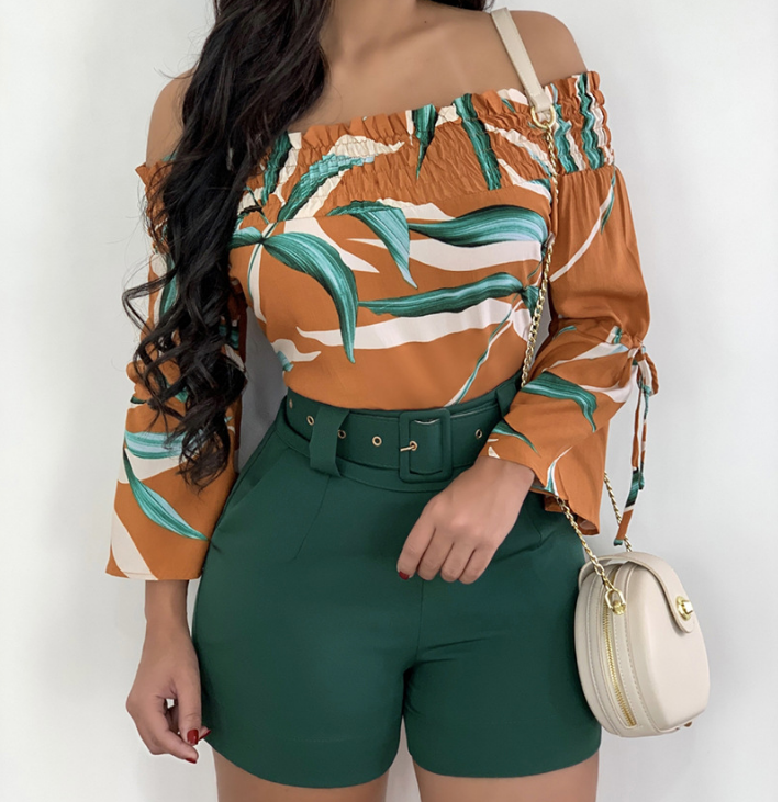 Long Sleeved Printed Off Shoulder Two Piece Dress