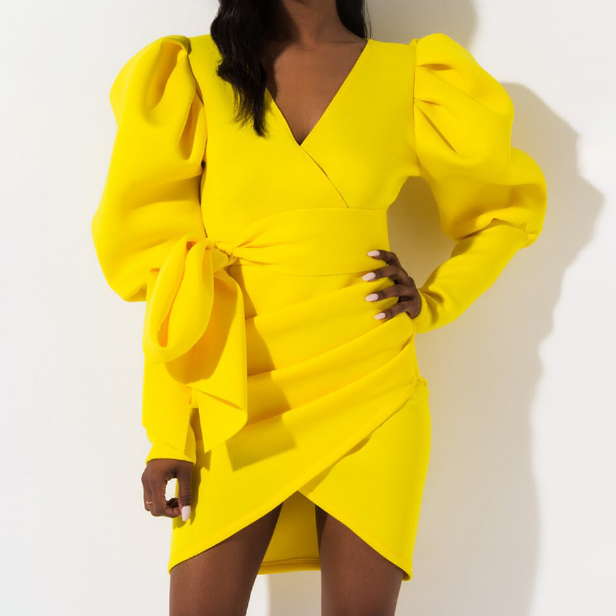Slim V-Neck Wrapped Chest Bow Long Sleeve Dress