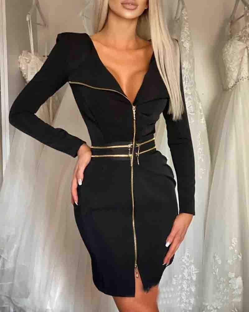 Long Sleeve Women'S Black Zipper Dress