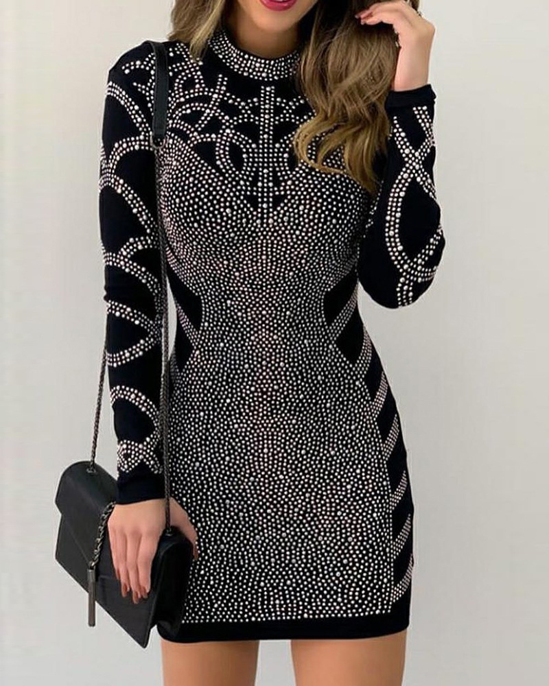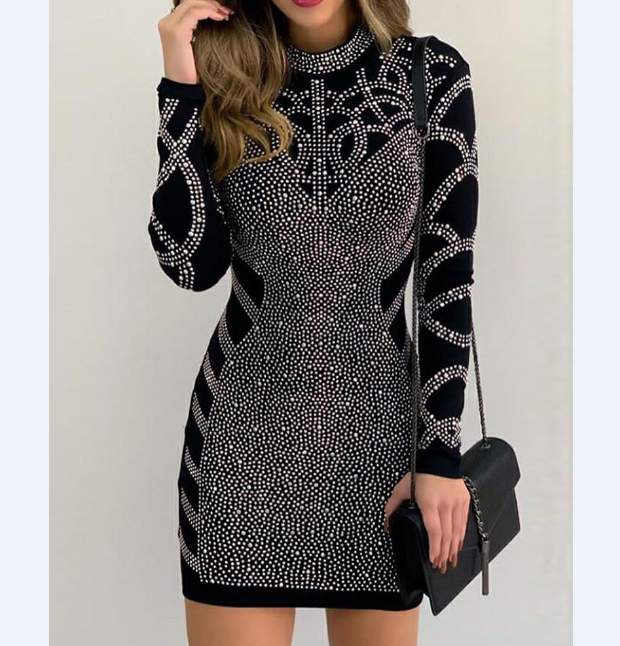 Casual Hot Diamond Long Sleeve High Neck Skinny Dress