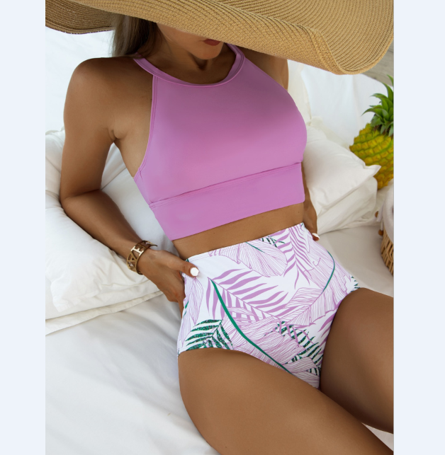 Printed Solid Color High Waist Leaf Bikini Swimsuit