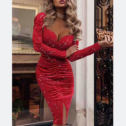 Red Women'S V-Neck Long Sleeved Dress