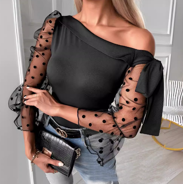Sexy Off Shoulder Mesh Ruffle Sleeve Top