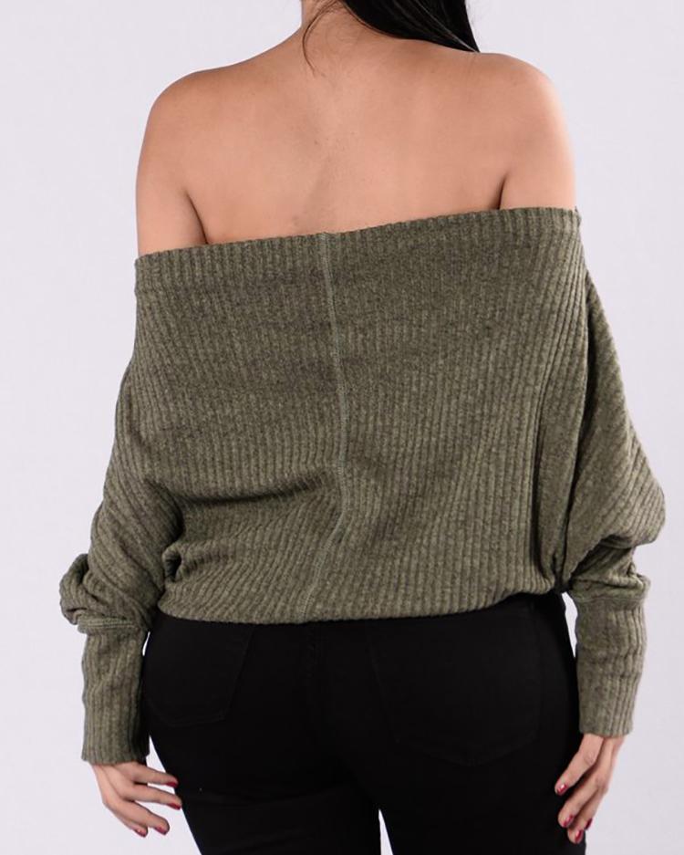 Round Neck Long Sleeved Off Shoulder Knitted Striped Sweater